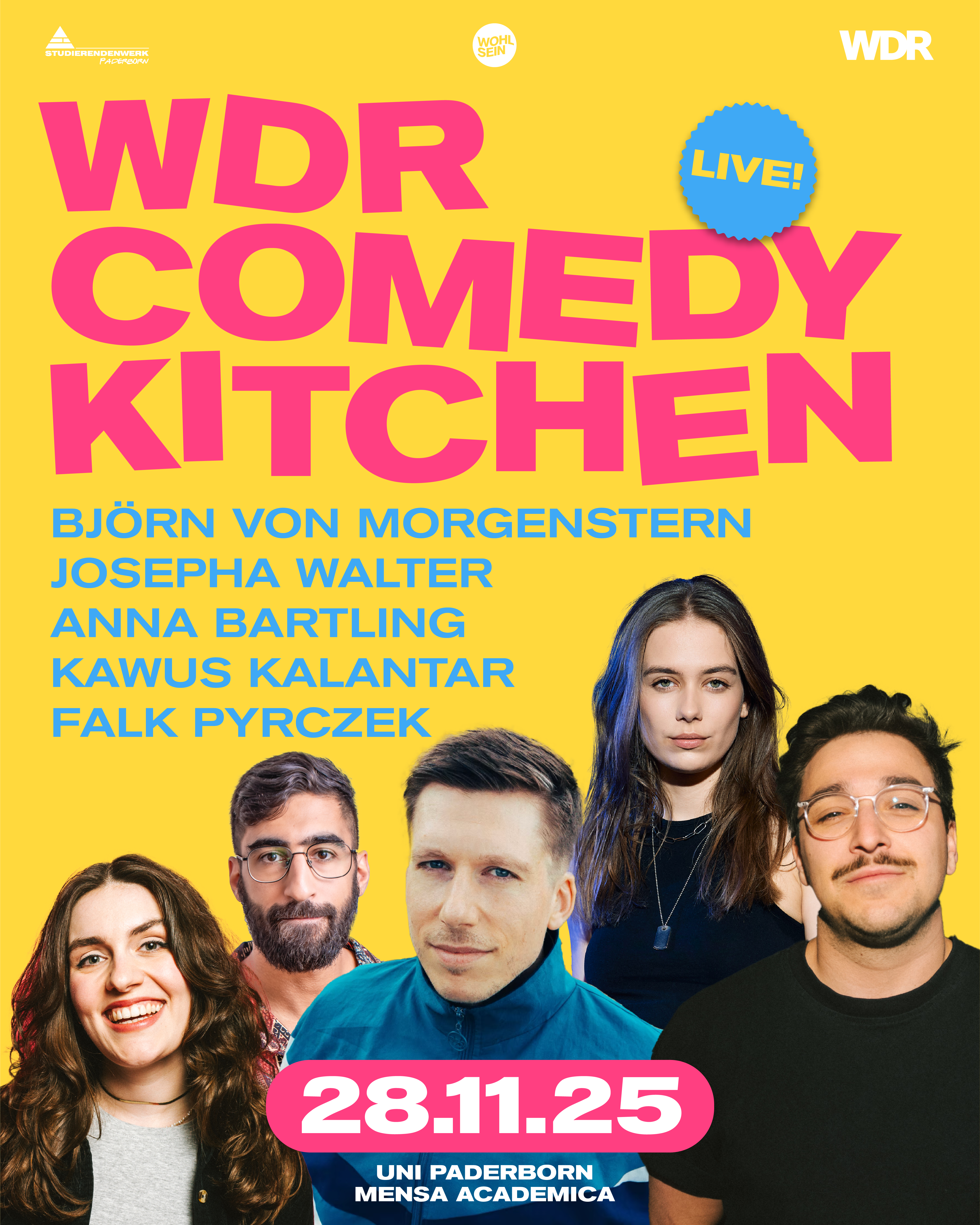 Die WDR Comedy Kitchen kommt nun schon das zweite Mal in die Paderstadt - nach der letzten ausverkauften Show wird am 28.11.2025 die Mensa Academica erneut zum Live Comedy Club und präsentiert schmackhafte Stand Up Comedy. Zu Gast sind dieses Mal: Björn von Morgenstern, Josepha Walter, Falk Pyrczek, Anna Bartling und Kawus Kalantar.